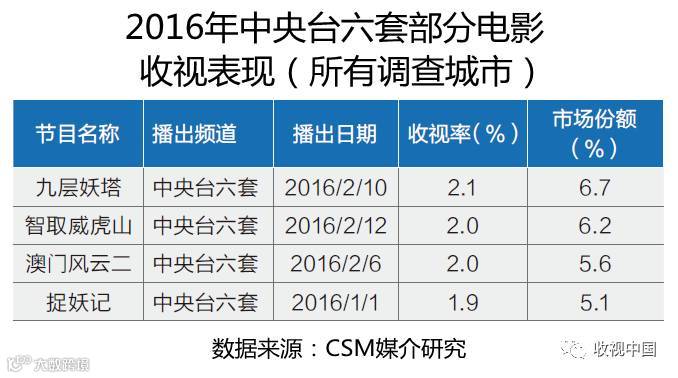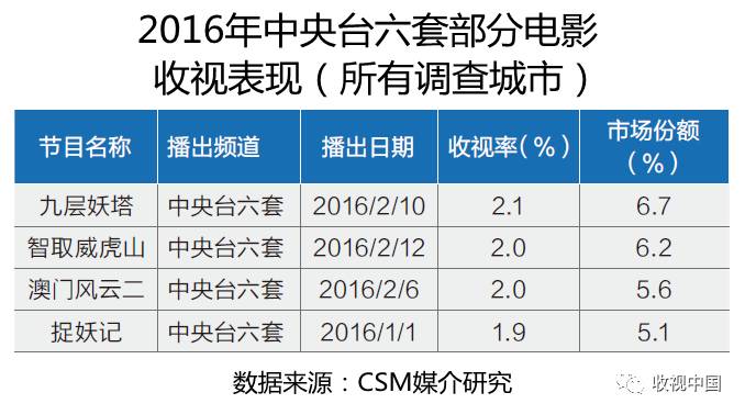 中央台六套假期播出的《九层妖塔》、《智取威虎山》、《澳门风云二》、《捉妖记》等多部电影获得了良好的收视表现。这几部电影都是位列2015年票房排行榜前列的国产影片。部分年度热门影片在年内的多次重播仍有不错的收视表现。