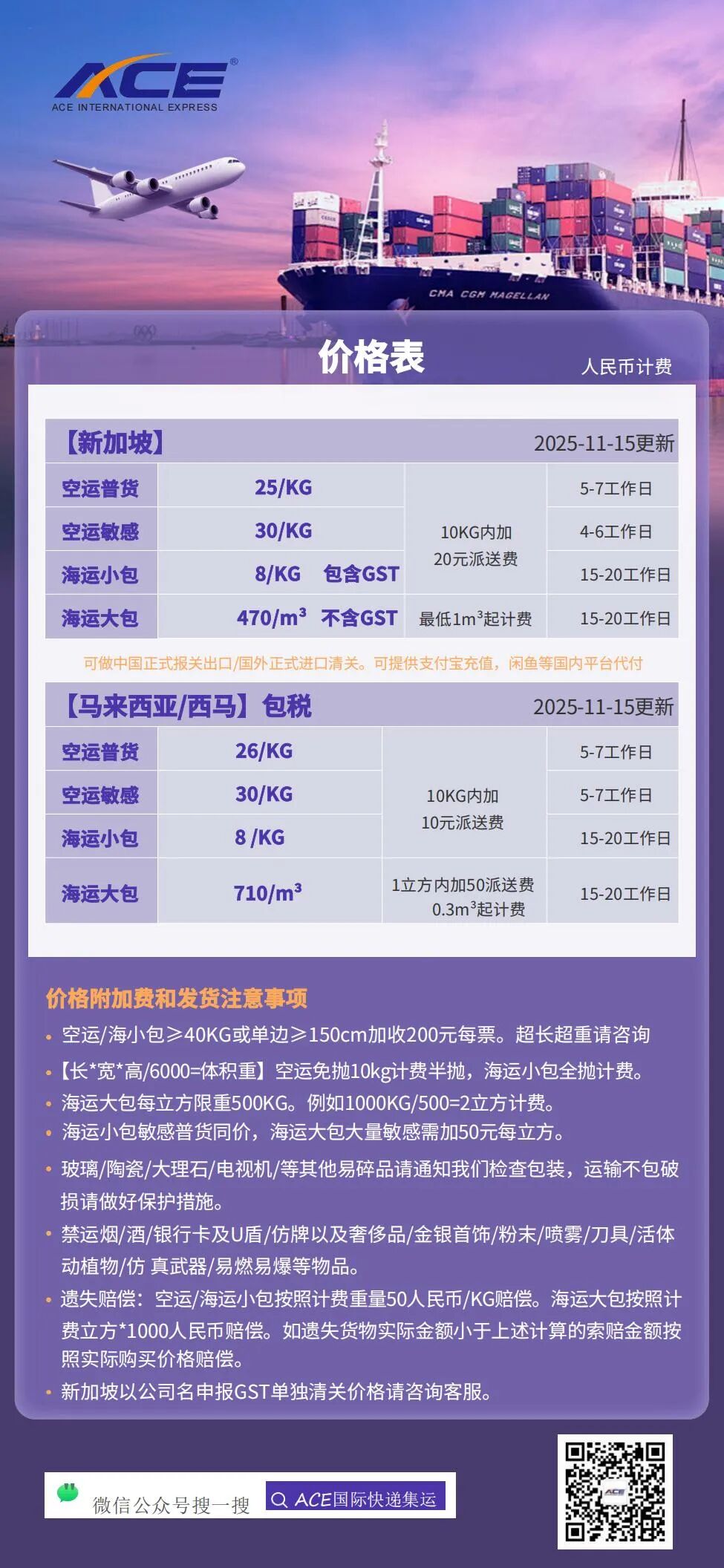 11年经验专注新加坡,马来西亚等国际物流服务。为海外客户网购淘宝提供打包仓储、报关、清关、集运、验收、转运、国际快递、运输、空运、船运、海运小包门到门等服务