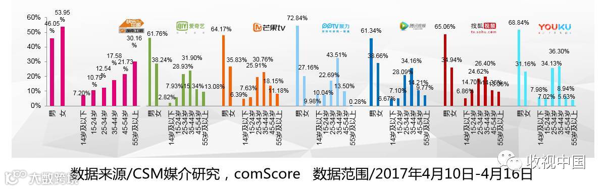 在电视端,《人民的名义》的女性观众比例高于男性,为53.95%;从年龄分布上看,55岁及以上的观众所占比例最高,为30.16%。在PC端,该剧在爱奇艺、芒果TV、PPTV、搜狐视频、腾讯视频和优酷网均为男性观众比例高于女性,与电视端形成反差;从年龄分布上看,几个平台均为35-44岁的观众比例最高,网络端各平台均与电视端形成反差。