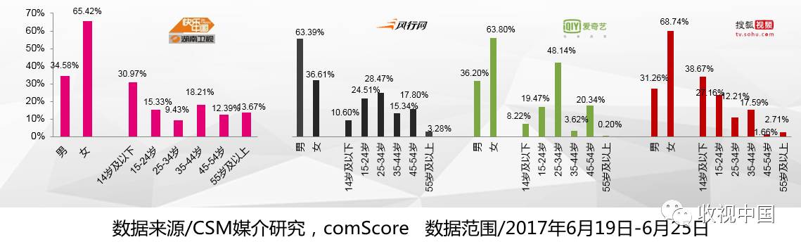在电视端,《夏至未至》的女性观众比例明显高于男性,为65.42%;从年龄分布上看,14岁及以下和35-44岁的观众为该剧的主要收视人群,分别为30.97%和18.21%。在PC端,该剧在风行网为男性观众比例高于女性,为63.99%,与电视端形成反差;爱奇艺和搜狐视频均为女性观众比例高于男性,与电视端保持一致;从年龄分布上看,风行网和爱奇艺25-34岁的观众为该剧的主要收视人群;搜狐视频14岁及以下的观众比例最高,为38.67%。