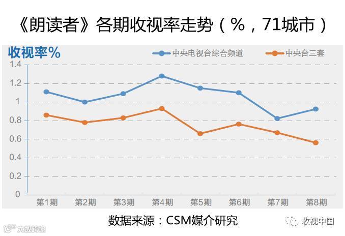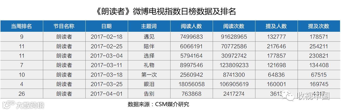 《朗读者》是中央电视台推出的大型文化情感类节目,节目创新了一种新的文化类节目模式——“访谈+朗读+轻解析”模式。以个人成长、情感体验、背景故事与传世佳作相结合的方式,用最平实的情感读出文字背后的价值,除文字及朗读本身外,朗读嘉宾分享的难忘的个人故事赋予了这些篇章新的情感甚至价值观,嘉宾访谈中流露出的个人情感、家庭温情、团队责任以及家国情怀使得被朗读的文字更具力量。节目从2017年2月开播到4月中旬共播出8期,其在央视综合频道的平均收视率为1.06%,在央视三套的平均收视率为0.75%。