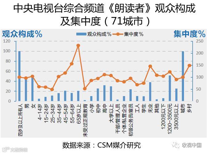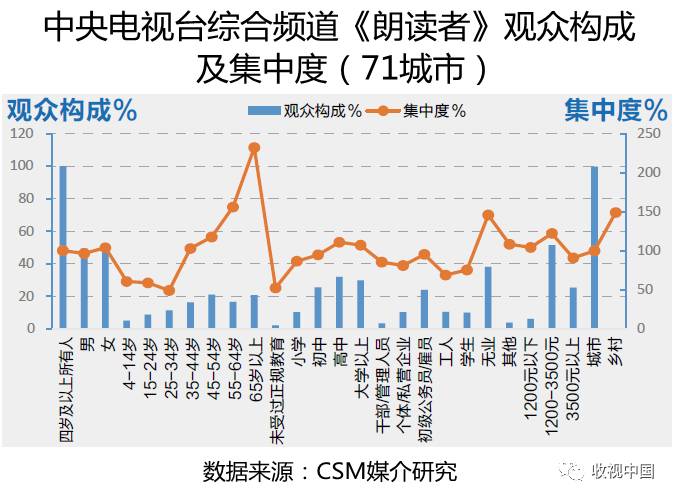 国家新闻出版广电总局宣传司司长高传力点评《朗读者》时说,“做这样一档文化类节目,没有情怀不行……年轻人实际上会喜欢有文化、高品位的节目。需求是有的,但首先电视人要有情怀,才能把一个有品位的东西传达给受众,能够去引导受众提高审美”。节目分类观众中,中老年观众、高中教育程度以上观众的集中度都较高,节目对这些人群的吸引力更强。