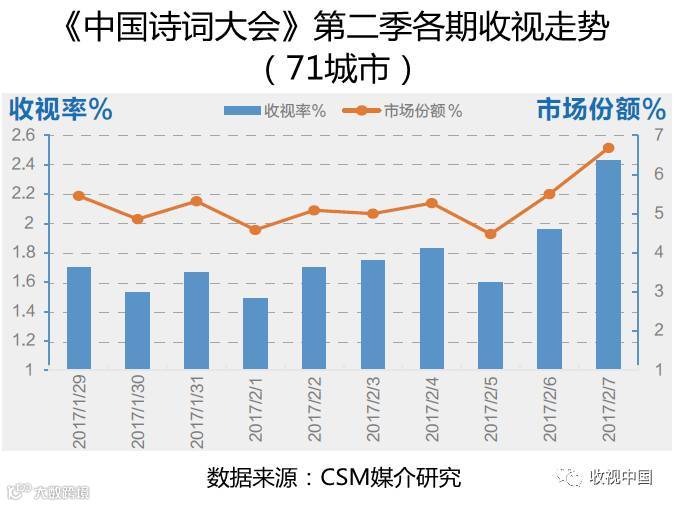 CSM媒介研究71城市收视调查数据显示,第二季《中国诗词大会》首播10期收视稳定且呈上升趋势,10期首播平均收视率高达1.77%,单期收视率一直稳定维持在1.5%-2%之间,2月7日第二季总决赛收视率达到2.43%。