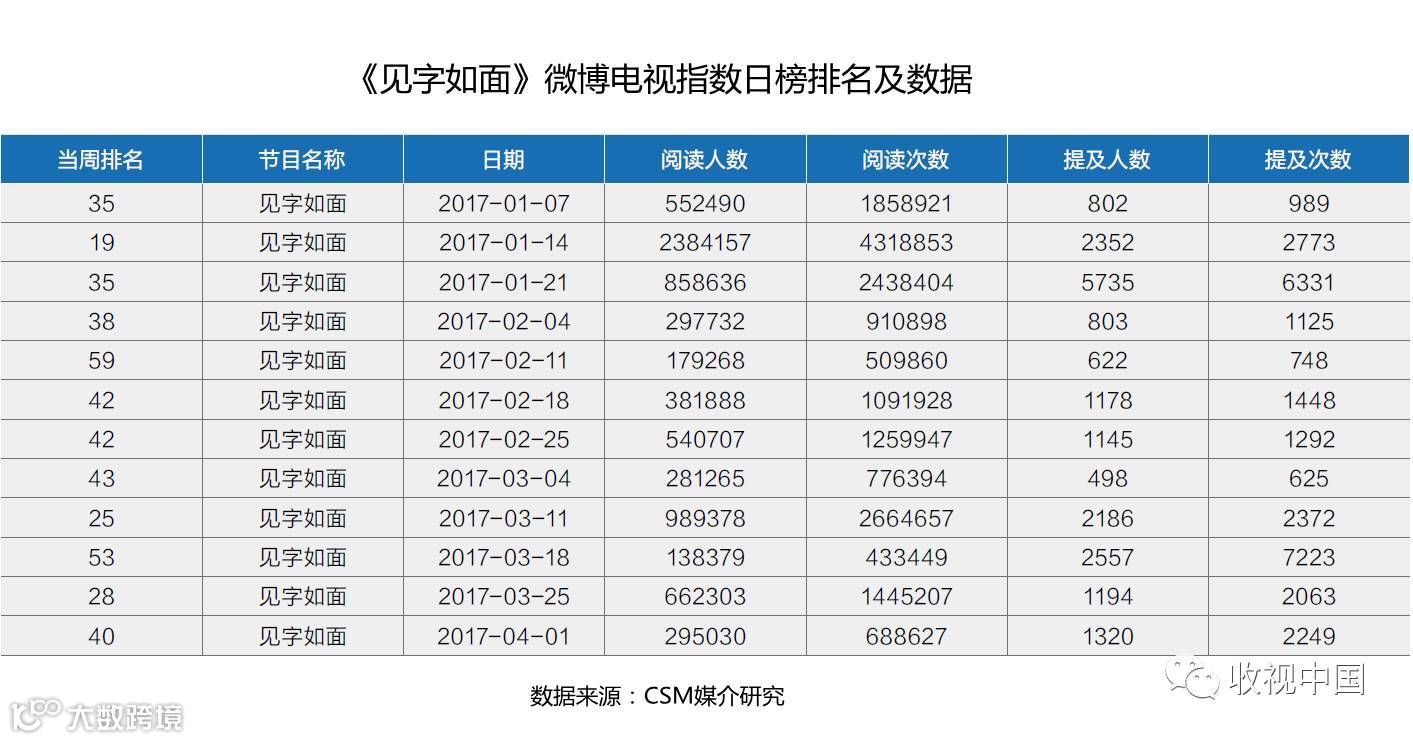 《见字如面》节目在新浪微博的相关内容阅读人数累计接近800万人,阅读次数累计超过1800万次。网络视频数据显示,节目相关视频的点击量超过1亿4千万次,单期相关视频点击量更是超过4000万。