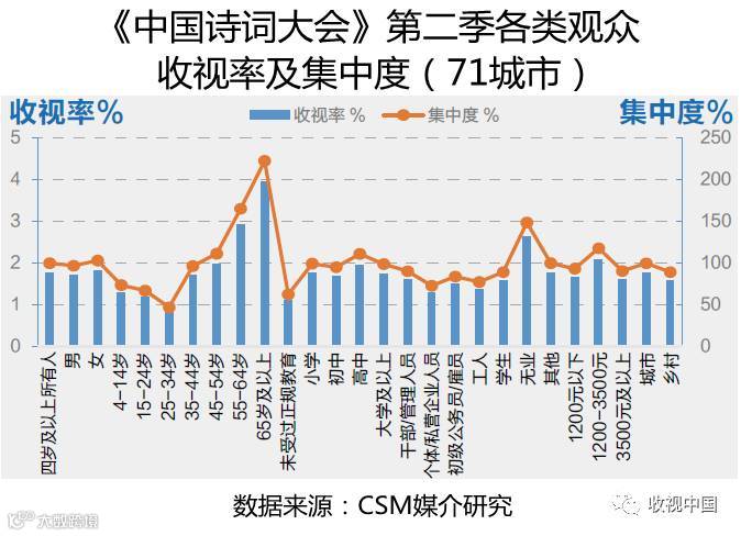 《中国诗词大会》的分类观众收视表现也较均衡,各类观众的收视率均较高,达到1%以上。老年观众对节目的喜爱程度尤其突出,55-64岁观众和65岁以上观众的收视率分别高达2.93%和3.94%,55岁以上观众的集中度更是高于160%。