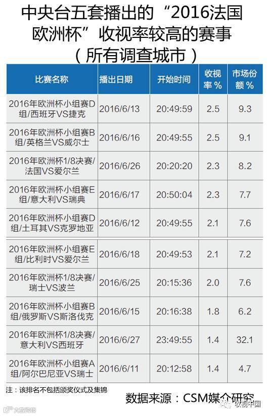这不仅让中国球迷避免了熬夜看球的痛苦,也让本届欧洲杯赛事在中国地区取得更好的收视佳绩。在欧洲杯收视率排名前十的赛事中,21:00开球的比赛占到了九场,仅有6月27日播出的焦点战役“欧洲杯1/8决赛/意大利VS西班牙”开始于24:00。收视率排名前两位的赛事分别来自小组赛“英格兰VS威尔士”和“西班牙VS捷克” ,收视率分别为2.6%和2.5%,市场份额均为9.4%。