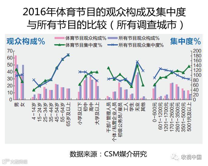 相较于所有节目的电视观众构成,体育节目中,男性观众、25-34岁青年观众、高学历观众和高收入观众比例相对更高,体现出了体育节目对于男性群体、高活跃度、高影响力和高消费潜力人群的吸引力。