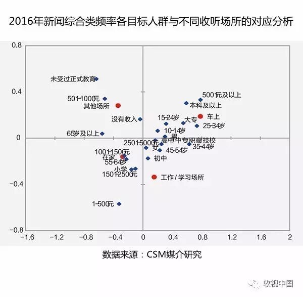 各目标人群与收听新闻综合类频率的场所对应分析表明,听众身份和工作生活习惯等属性与收听场所高度契合。