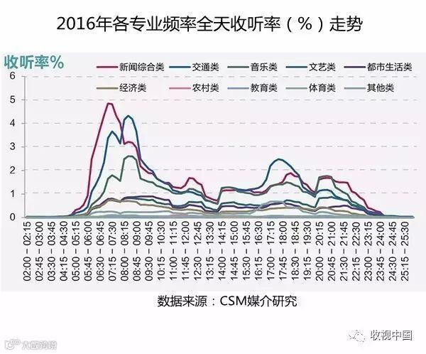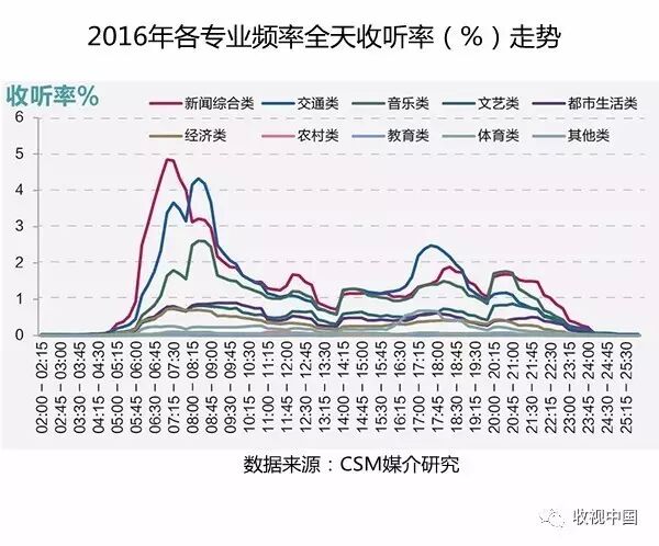 交通类和音乐类频率全天也均有良好收听表现,其中交通类频率在早晚上下班高峰期间的收听率有明显凸起,音乐类频率全天收听走势较为平稳,这一点与其他类别频率类似,也凸显出此类频率较强的伴随休闲特征。