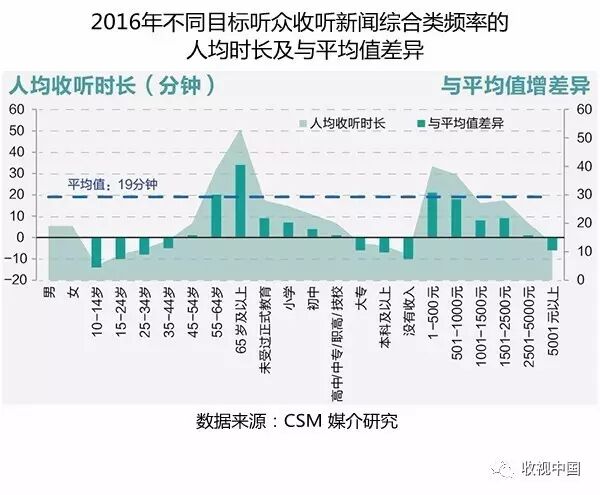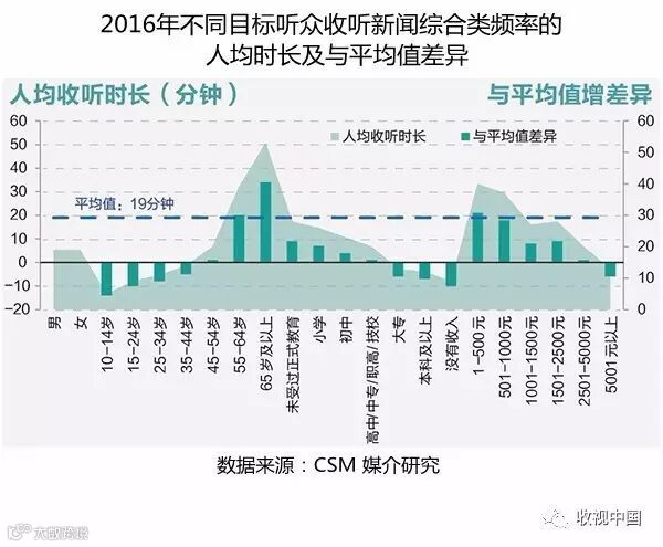 总体而言,中老年和中低收入者收听新闻综合类频率的时间较长,均高于平均水平。