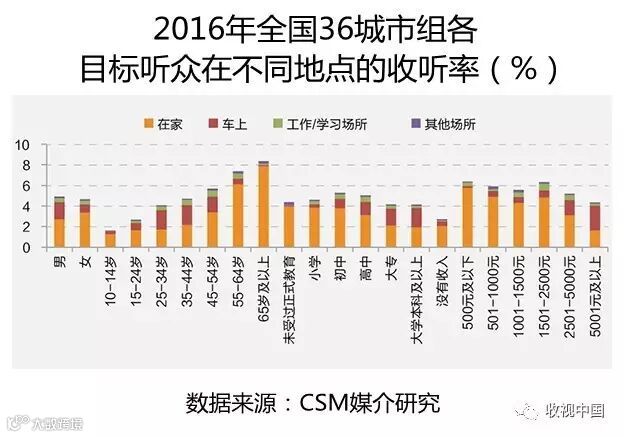 自从车载收听市场蓬勃发展以来,听众的区隔、分化就越来越明显,基本形成两个不同的听众市场,2016年继续延展了这个现象。在家户内收听的听众,基本上以中老年、女性、受教育程度低、收入较少的退休人员为主;而在车上、工作/学习场所中,则以男性、中青年、受教育程度高和收入较高的职业人群为主。“在家”及“车上”两个市场差异明显的听众群体吸引不同的广告,大量品牌硬广告更多地流向含金量更高的车载收听市场,而家户内收听市场则基本上是医疗专题的天下,其影响的对象还是以中老年群体为主。部分城市的医疗专题有了转型和替代。除一线城市外,有些城市电台在分频的频率中大量开辟医药专题节目,但其收听率不高,影响面有限。