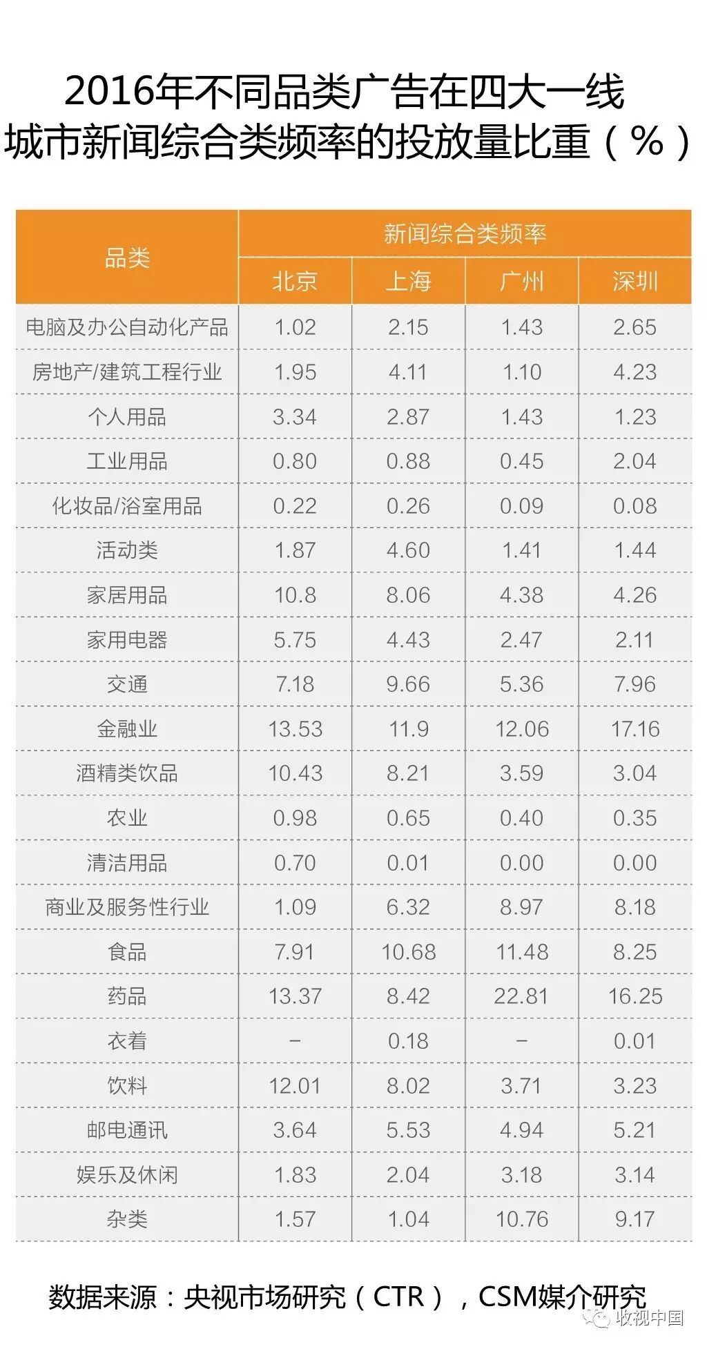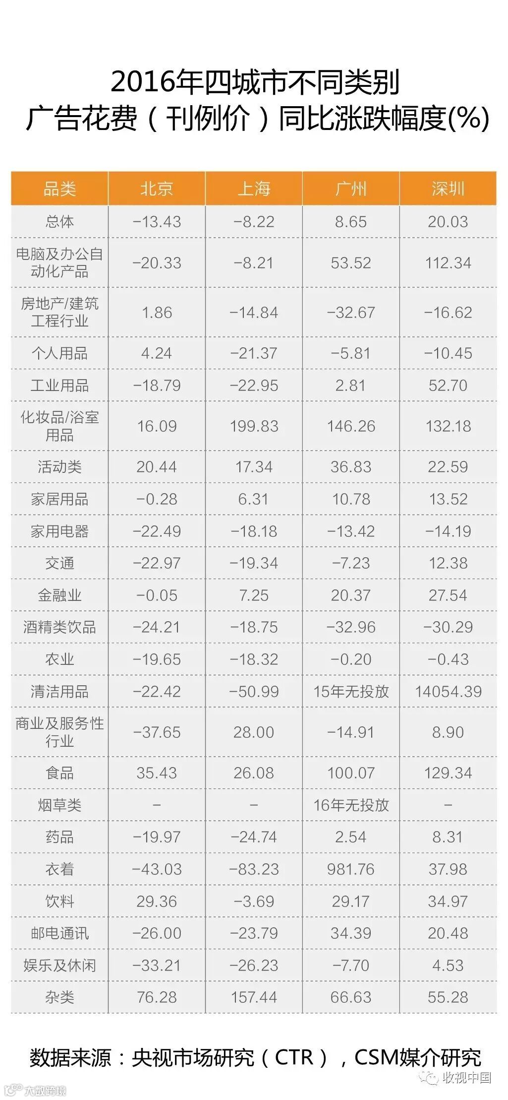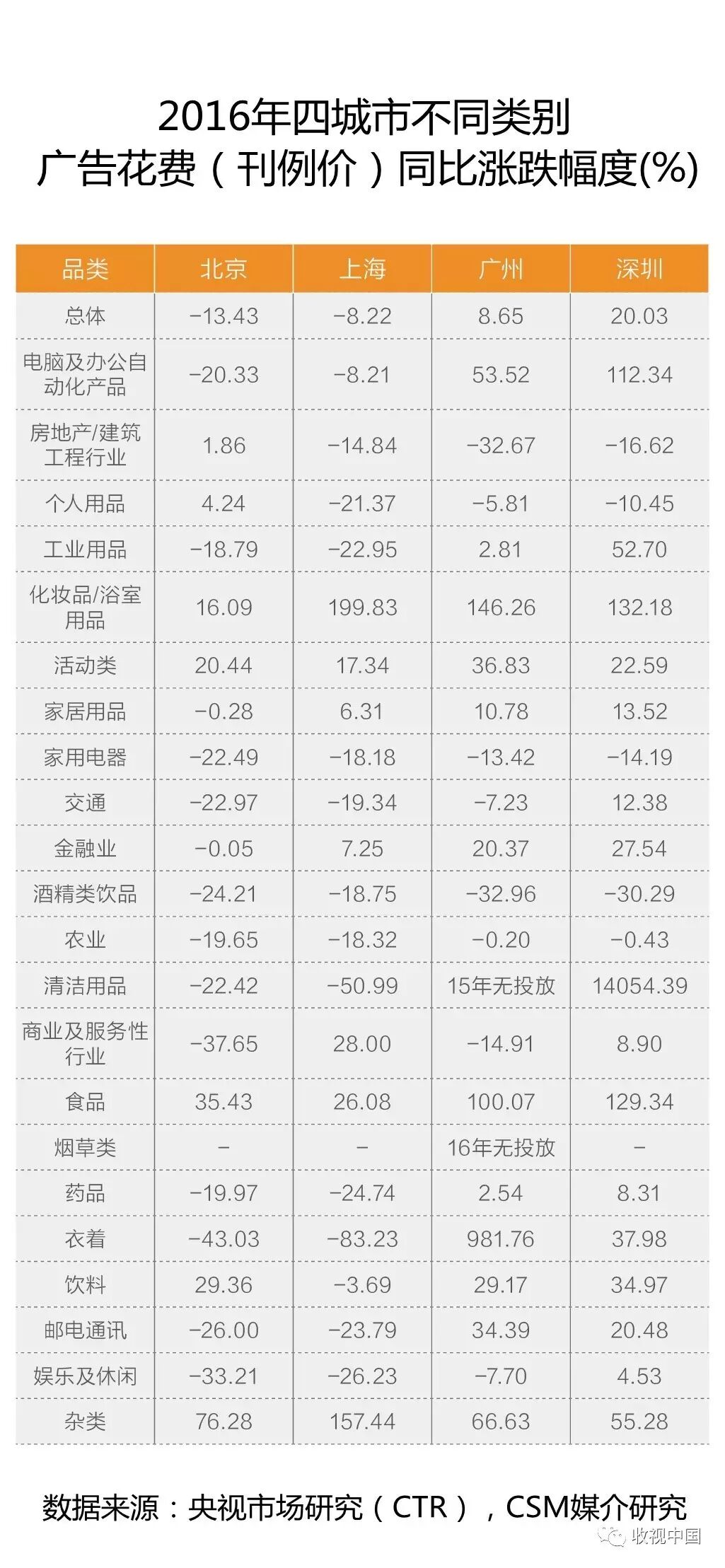 四城市中普遍上涨的品类均包括“化妆品/浴室用品”,上海、广州和深圳增长幅度超过三位数,北京也有两位数的增长;普遍上涨的还有“活动类”、“食品”和“杂类”。在北京涨幅较大的还有“饮料”,其他多数品类呈现下降态势;在上海涨幅较大的还有“杂类”、“食品”和“商业及服务型行业”;广州的“衣着”、“食品”增长幅度达三位数,“电脑及办公自动化”和“杂类”等涨幅超过50%;深圳的“电脑及办公自动化”和“食品”的涨幅也达到三位数;值得一提的是清洁用品的投放大幅度回升,涨幅更是达到14054.39%的程度,当然这跟2015年该品类投放的大幅度缩减密切相关。