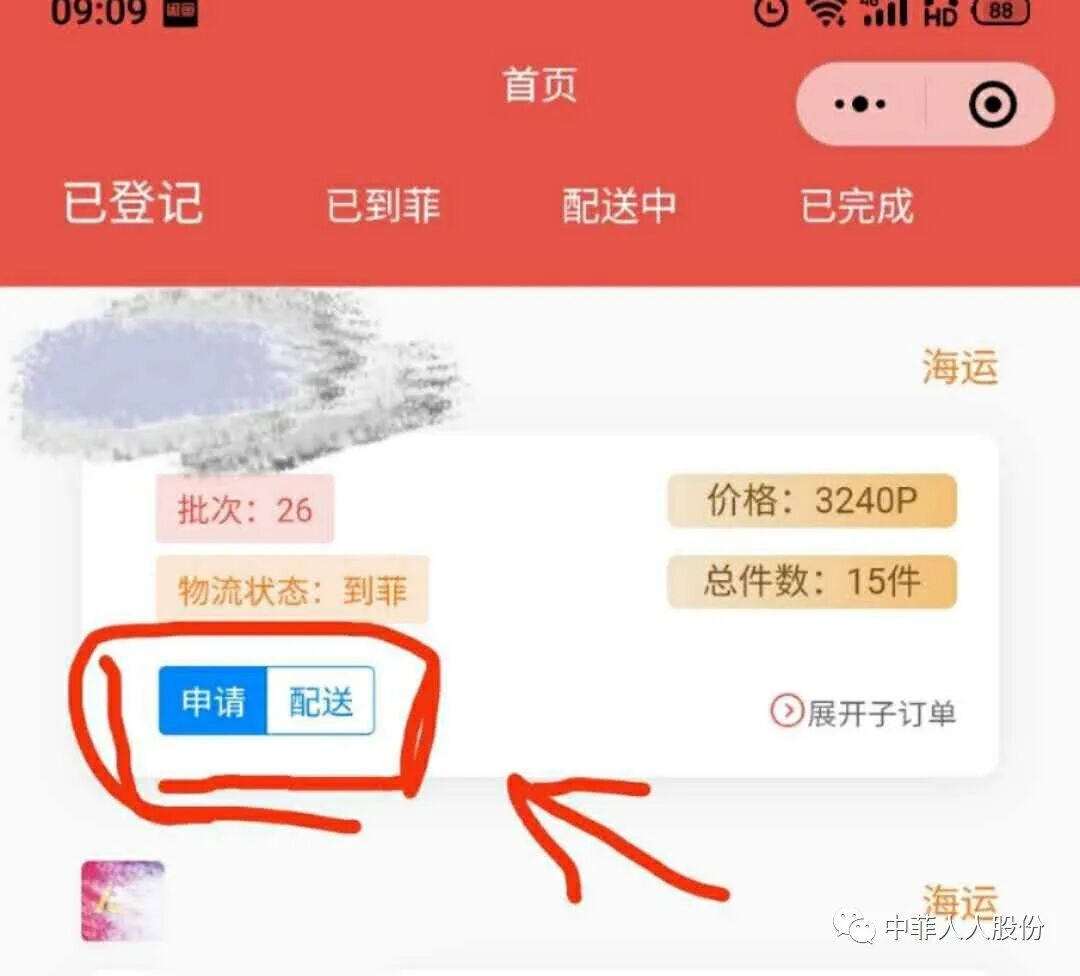 有收到手机短信通知或者小程序里显示价格可以直接在 【公众号】-【登入个人中心】-【首页】-【填写申请配送】 具体如下示例图指示操作。