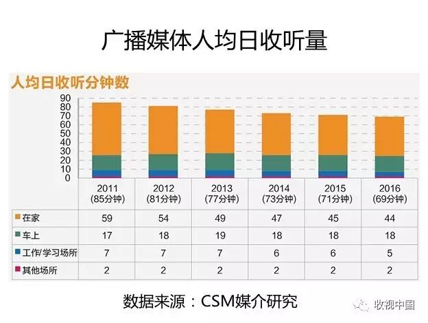 人均收听分钟数的降低,还伴以总体广播收听率的降低,即广播媒体的听众数量规模也有所降低。调查数据显示,2016年全天时段总体广播收听率为4.79%,环比降低的势头仍未停止。分收听场所来看,车上收听率的增长从2014年开始放慢脚步,2016年车上收听率为1.26%,较上年增长仅0.02个百分点。同期,在家收听率跌势未止,2016年在家收听率为3.02%,较上年降低0.12个百分点,而较五年前的2011年的4.08%,已经大幅度地降低了近1.1个百分点。