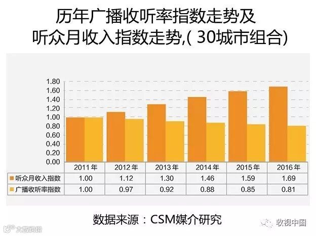 总体广播收听率的走低,意味着市场上收听广播的总人数及他们花费在收听广播上的时间会有所减少。以2011年至2016年波次调查日期贯通的30城市组合为例,将2011年的总体广播收听率设为基数为1,则其后历年的指数多呈现降低趋势,到2016年这一指数已降低至0.81,也就是说,2016年整体广播听众规模仅为2010年的81%。