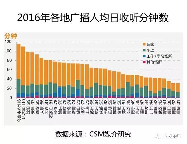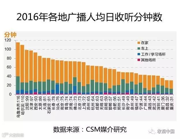 分城市来看,乌鲁木齐、哈尔滨、沈阳、天津、西安、太原、大连、石家庄、长春、汕头和南京人均日收听分钟数较高,超过75分钟,乌鲁木齐、哈尔滨、沈阳和天津更是以100分钟左右的收听量领先全国市场,相对而言,重庆、南昌和厦门的广播收听量较低,没有超过40分钟。