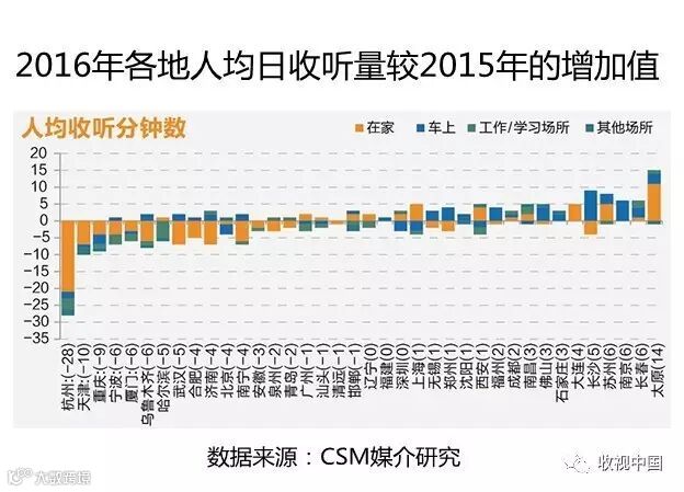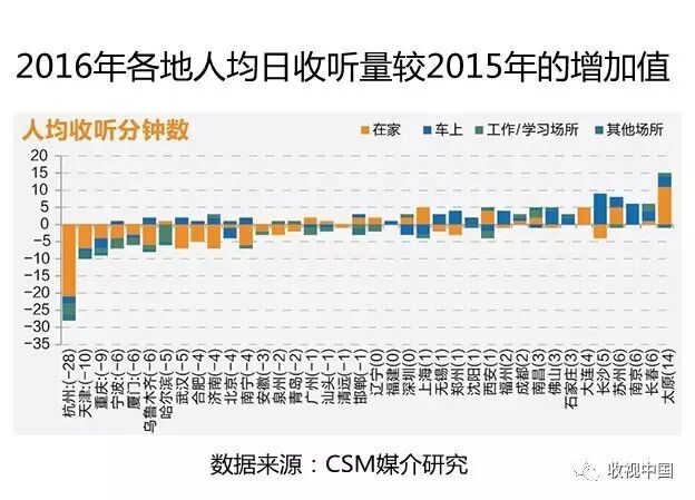 相比于2015年的数据,2016年仅有太原、苏州、南京、长春、长沙和大连等市场的广播收听量有所增加,且主要是车上收听量的增加所致。而杭州、天津、重庆、宁波、厦门、乌鲁木齐、哈尔滨、武汉、合肥、济南、北京和南宁等市场的收听量有明显降低,且主要是在家收听降低所致。在总体收听量降低明显的乌鲁木齐、武汉、济南、南宁、宁波、合肥和邯郸,车上收听量还有明显提升。