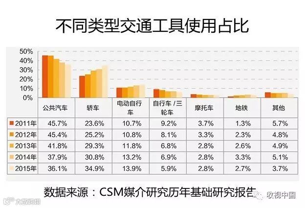 前述车上收听率的增长源自车载收听人口的增加,这一情况在CSM媒介研究广播收听调查基础研究数据中有很好的印证。广播收听作为受众媒介消费的重要组成部分,必然受到媒介环境变化的影响。广播是一种具有高度伴随性的媒体,其收听率的高低,与受众的日常作息和交通方式有一定关联。CSM媒介研究广播收听调查基础研究数据显示,2015年轿车作为交通工具的使用占比已经高达35%,较2011年的数据增加了11个百分点,轿车作为交通工具占比的快速增长,一方面会促进车上收听率的增长,另一方面,也会预示车上收听市场天花板效应的即将到来。