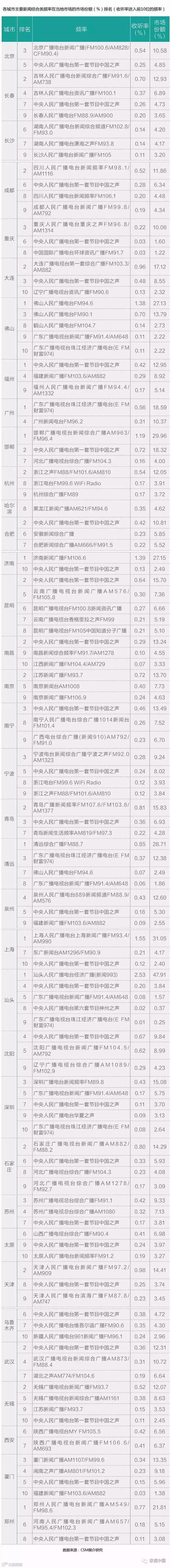 其中汕头人民广播电台经济广播(新闻993)、上海人民广播电台上海新闻广播FM93.4/AM990、邯郸广播电视台新闻综合广播AM963/FM96.4、清远综合广播FM88.7、济南新闻广播FM106.6、佛山人民广播电台FM94.6、郑州人民广播电台新闻广播AM549/FM98.6、广东广播电视台珠江经济广播电台(E FM财富974)和中央人民广播电台第一套节目中国之声分别在汕头、上海、邯郸、清远、济南、佛山、郑州、广州和福州9个城市的市场份额排在当地所有频率中的首位,且大多数为本地新闻综合类广播频率。
