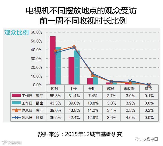 观察电视机摆放在客厅和摆放在卧室的观众收视时长比例,电视机放置在客厅的观众短时收视比例,要高于电视机摆放在卧室中的比例。在工作日,除短时收视之外,电视机摆放在卧室中的观众比例超过客厅。在休息日,中长收视时间的观众比例,客厅则高于卧室。超长收视时间的观众比例,无论工作日亦或休息日,卧室比例均较高。