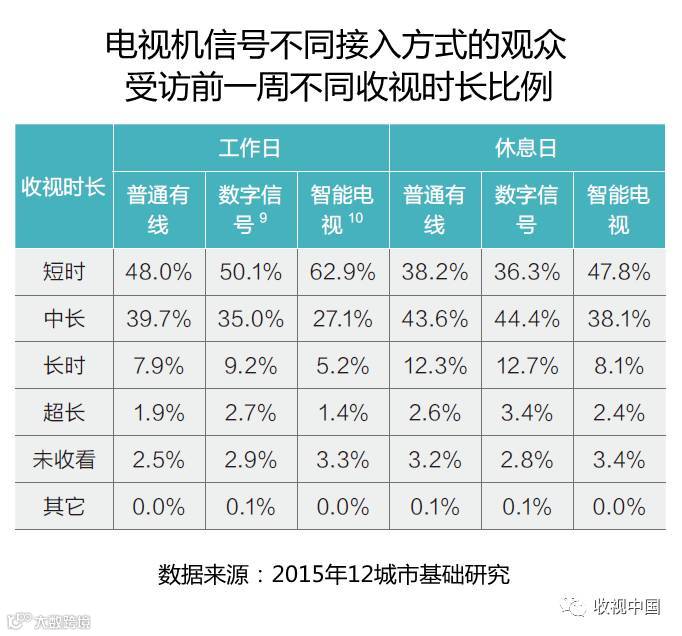随着电视机功能的增加,那么是否会获得观众更多的关注,延长收视时间呢?显然从基础研究的调查结果来看,电视功能增加并未能延长观众收视时间。智能电视观众短时收视时间的观众比例,显著高于其他信号接入方式的比例,而智能电视其余收视时间的比例则普遍低于其他观众,工作日较休息日更为明显。