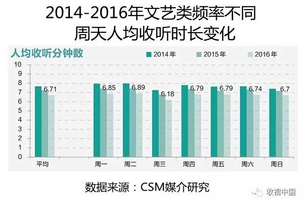 文艺类频率在2016年的人均收听时长为6.71分钟,近三年来呈持续下跌走势,从不同周天的收听时长走势看,周一和周二相对较高,周三为最低点,与前两年的走势较为相似。