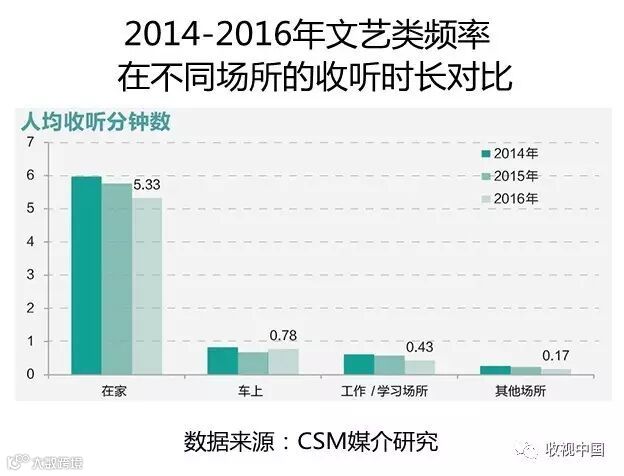 “在家”是听众收听文艺类频率的主要场所,收听时长为5.33分钟,接近收听文艺类频率总时长的八成,“车上”、“工作/学习场所”和“其他场所”人均收听时长均不足1分钟,与2015年对比,除“车上”止跌回升外,其他各场所逐年下跌。