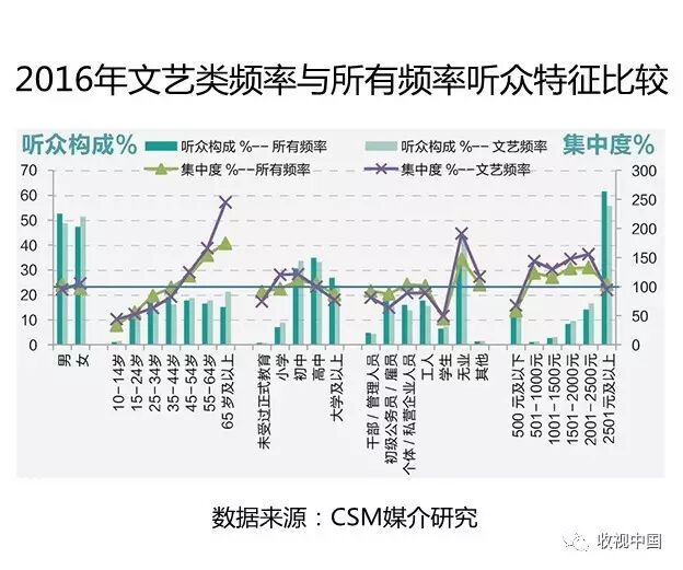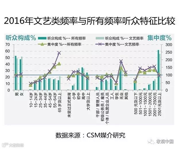 文艺类频率主要吸引女性、45岁及以上、小学/初中、无业和其他、中低收入听众收听,相比整体市场,性别上有差异,年龄较为吻合,学历则更偏向于低学历群体。