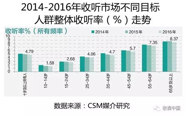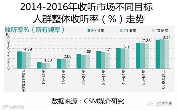2016年整体收听市场总收听率为4.79%,对比前一年的4.94%下跌幅度为3.04%,延续近年来的下跌走势,但跌幅有所收窄。从不同听众收听情况来看,广播的主力听众仍为中老年群体,随着年龄的增长,其收听率逐渐上升,65岁及以上听众收听率为8.37%,而10-14岁听众只有1.58%。与2015年相比,各年龄段均有不同程度的下跌,其中45-64岁、15-24岁和65岁及以上听众跌幅相对较大。