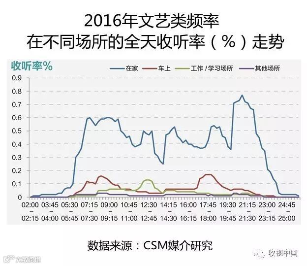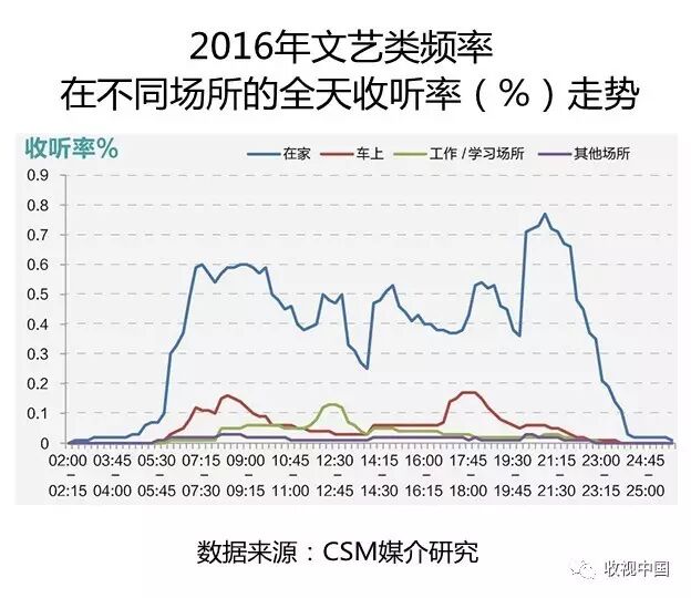 听众主要“在家”收听文艺类频率,因而从全天收听走势来看,“在家”各时段的收听率均高于其他各场所,其中07:00-10:00、18:00-19:00和20:00-22:00时段呈现较明显的收听高峰,收听低谷则在午间13:00-14:00时段,“车上”收听高峰时段则是上下班时间的07:00-09:00和17:00-18:45时段,“工作/学习场所”的收听率在12:00-13:00较高,“其他场所”无明显收听高峰。