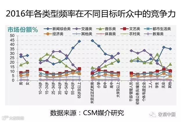 文艺类频率在女性听众中的竞争力高于男性,年龄段上在10-14岁和45岁及以上听众的市场份额较大,高于9.4的平均值,其中,65岁及以上听众的市场份额仅次于新闻综合类频率,受教育程度方面,在小学学历的听众中竞争力较强,而随着学历的提升,竞争力有下跌趋势,职业类别上,在学生、无业和其他职业群体中所占市场份额相对较高。