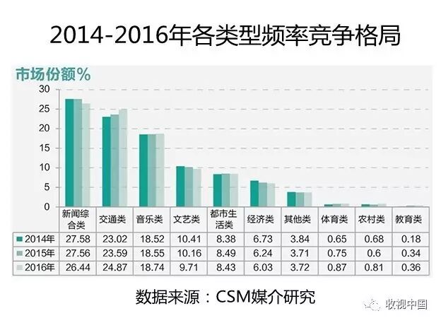 在频率竞争方面,近年来各类型频率的竞争格局基本保持稳定,但不同类型频率的发展趋势各有不同,新闻综合类频率逐年回落,交通类和音乐类频率则持续上升,继续维持三甲位置。文艺类频率的市场竞争力在近三年持续下跌,2016年的市场份额为9.71%,对比2015年的10.16%下跌幅度为4.43%,跌幅相比前一年有所扩大,是各类型频率中跌幅最大的频率,虽仍能保持第四的位置,但与前三位的差距进一步拉开,其后的都市生活类和经济类频率也有小幅下滑,后四位的频率则均有不同幅度的上升。