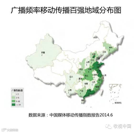 从省域分布上来看,广播频率移动传播百强涵盖24个省、自治区、直辖市(不包括港澳台地区),集中于东中部地区。其中北京有15家(含国家级广播电台),广东11家,山东、江苏各10家。东西部广播移动差距较大,沿海城市移动化程度最高。