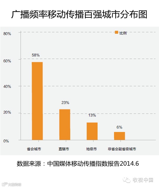 从城市分布上来看,百强广播频率省会城市占比最大,为58%。其中广州、郑州、南京数量最多,分别为8家、6家和5家。尚有5家广播频率分别位于少数民族自治区首府新疆乌鲁木齐和广西南宁。四个直辖市共有23家广播频率进入百强,其中北京最多,为15家,同时北京也是所有城市中拥有百强广播频率最多的城市。