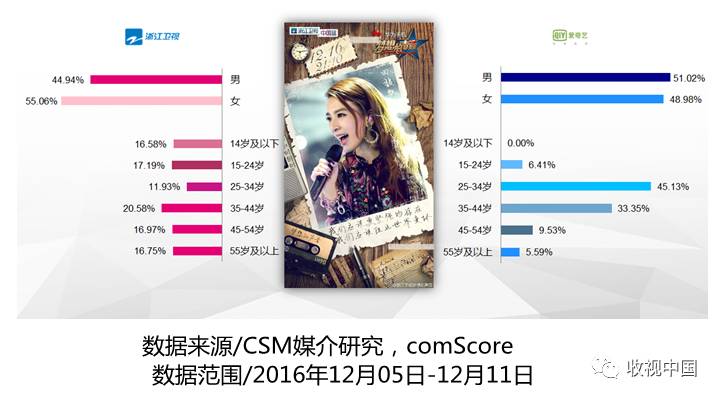 在电视端,《梦想的声音》的女性观众比例略高于男性观众,为55.06%;从年龄分布上看,该节目在各个年龄层的分布相对平均,其中35-44岁的观众所占比例最高,为20.58%。在PC端,该节目在爱奇艺的男性观众比例和女性观众比例相差不大,分别为51.02%和48.98%,与电视端略有差异;从年龄分布上看,该节目的主要收视人群分布在25-34岁和35-44岁,分别为45.13%和33.35%。