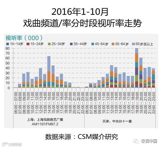 而在天津电视收视市场,CCTV-11的两个收视率高峰分别出现在12:00-13:00和18:00-19:00时段,也以55岁及以上人群为主,在非高峰的14:00-18:00时段,65岁及以上人群占比超过50%。