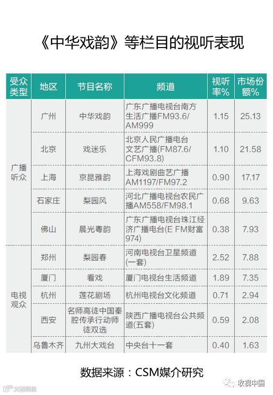 戏曲类节目虽然受众较窄,但一些品牌类戏曲节目或者选秀类戏曲节目也能在竞争激烈的视听市场掀起视听高潮,有的节目甚至能获得中青年受众的青睐。数据显示,收听率突出的戏曲类节目有广东广播电视台南方生活广播FM93.6/AM999播出的《中华戏韵》、北京人民广播电台文艺广播(FM87.6/CFM93.8)播出的《戏迷乐》、上海戏剧曲艺广播AM1197/FM97.2播出的《京昆雅韵》和河北广播电视台农民广播AM558/FM98.1播出的《梨园风》。广东南方生活广播1730播出的《中华戏韵》和北京文艺广播的《戏迷乐》表现尤为突出,在这两档节目播出的时段,当地市场收听广播的总人口中,超过五分之一的受众在收听这两档节目。