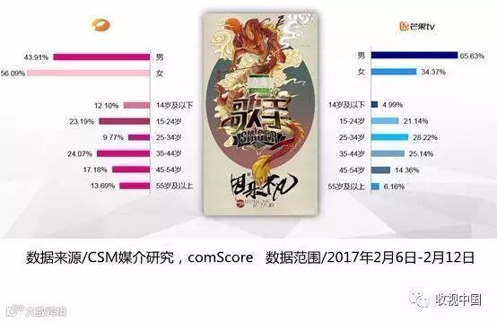 在电视端,《歌手》的女性观众比例明显高于男性观众,为56.09%;从年龄分布上看,15-24岁、35-44岁和45-54岁的观众为该节目的主要收视人群,分别为23.19%、24.07%和17.18%;在PC端,该节目在芒果TV的男性观众比例明显高于女性,为65.63%,与电视端略有差异;从年龄分布上看,15-24岁、25-34岁和35岁-44岁的观众为该剧的主要收视人群,分别为21.14%、28.22%和25.14%。