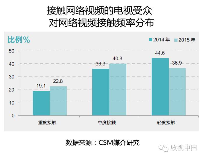 将所有接触网络视频的电视受众按照接触频率来划分,重度接触所占比例为22.8%,较2014年增加了3.7个百分点;中度接触所占比例为40.3%,较2014年增加了4个百分点;轻度接触所占比例为36.9%。