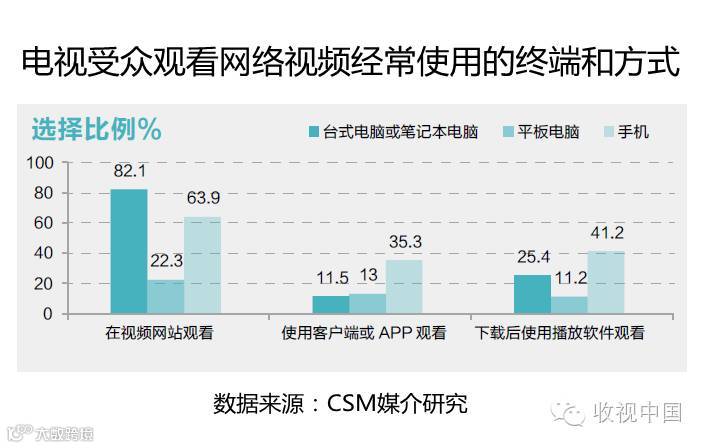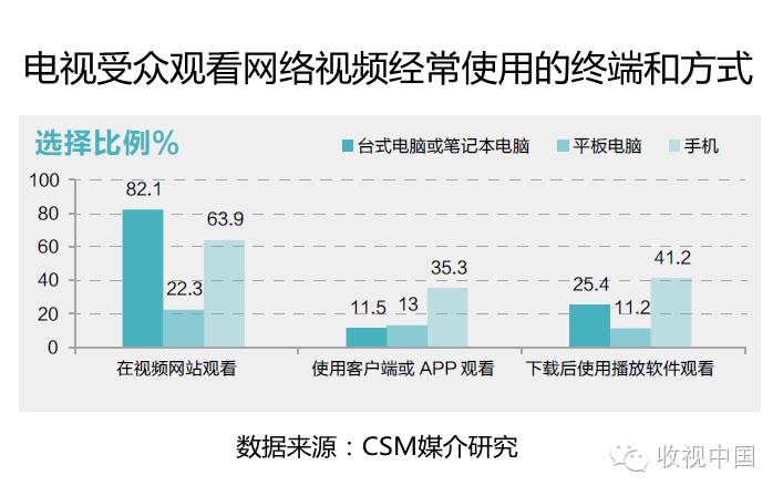 在电视受众中,使用台式电脑或笔记本电脑在视频网站观看视频的选择比例达到82.1%,在固定地点(家、工作单位或其他地点)通过视频网站收看网络视频仍是电视受众中网络视频用户的首选。据CNNIC在2016年1月发布的互联网络发展状况统计报告指出,我国通过手机上网人群的占比已经达到了90.1%。