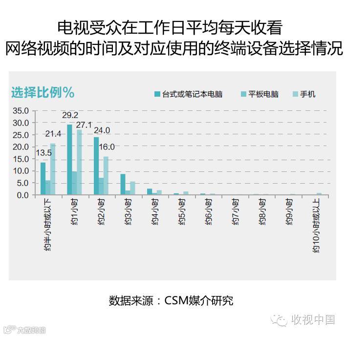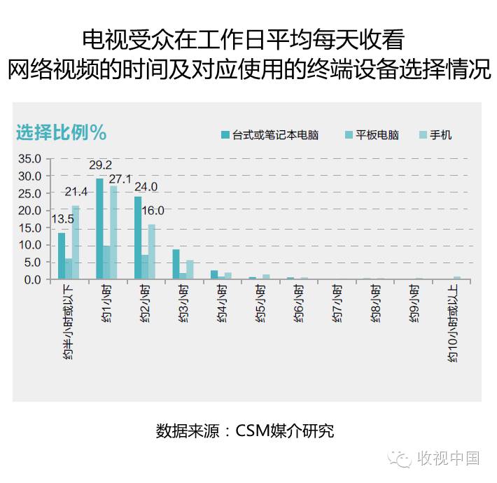 在工作日,收看时长为约1小时的选择比例最高,台式或笔记本电脑和手机两个终端的选择比例均接近30%;半小时或以下的短时间网络视频收看,使用手机终端的选择比例则为最高;约2小时的网络视频收看时间的选择,所使用的终端也以台式或笔记本电脑最多。