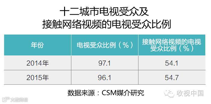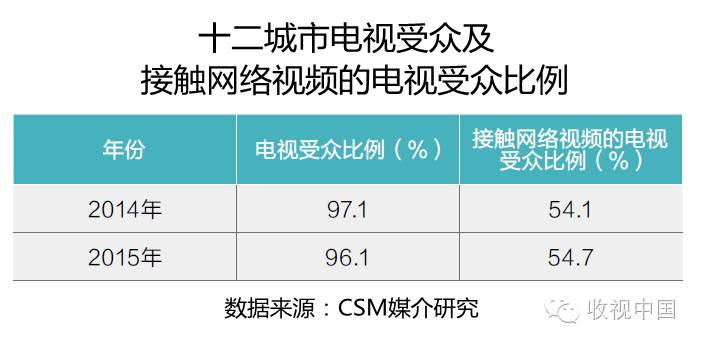 根据CSM媒介研究2014年-2015年十二城市基础研究数据,近两年十二城市电视受众比例基本保持在95%以上,2015年较2014年略有微降;接触网络视频的电视受众比例占电视受众总体的一半以上。