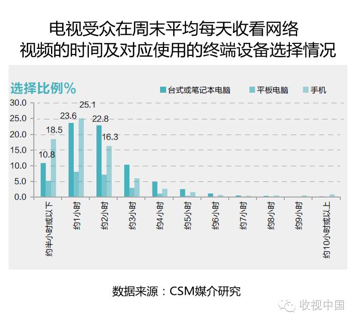 在周末,仍然以2小时内的网络视频收看时间选择为主,但使用手机终端选择比例在半小时或以下和约1小时两项选择中,均超过了台式或笔记本电脑。3小时以上的长时间网络视频收看的比例较工作日相比也有所增加。