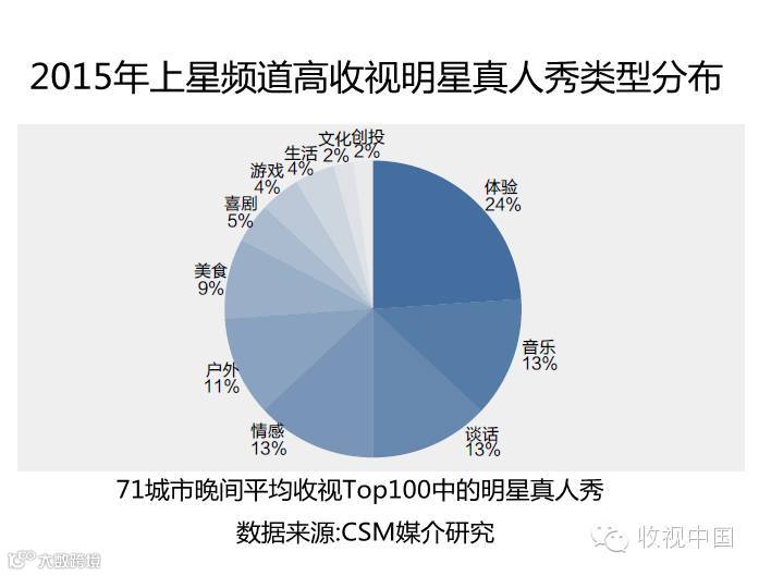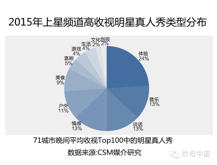 作为电视节目创新的一个重要领域,电视真人秀在选择明星还是素人作为主体的问题上一直存在颇多争议和讨论。而在电视市场的实践中,明星真人秀凭借着较高的话题热度和收视保障一直占据主导地位,2015年上星频道在71城市晚间18:00-24:00平均收视最高的100档常态新节目中,以明星作为主体的真人秀占据近一半的比重,明星成为电视节目创新中的最显眼标签。