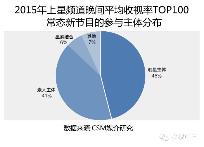 在我国,素人真人秀和明星真人秀一直凭借各自的特色交相发展。2015年上星频道在71城市晚间18:00-24:00平均收视最高的100档常态新节目中,以素人作为主体的真人秀占比为41%,略低于明星主体真人秀,以明星和素人共同作为参与主体的节目也占据6%的比重。