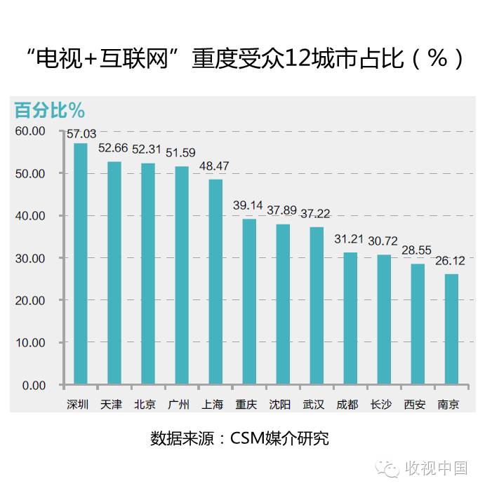 重度受众在12城市中所占比重各有不同。其中,深圳、天津、北京、广州、上海的占比情况较为突出,均在50%左右;尤其在深圳,重度受众占比高达57.03%,说明在这5个城市中,每天均接触电视和互联网媒体的受众已接近及超过半数之多。相比之下,重庆、沈阳、武汉、成都、长沙、西安、南京7个城市的重度受众占比明显较低,大约在25%-40%之间。