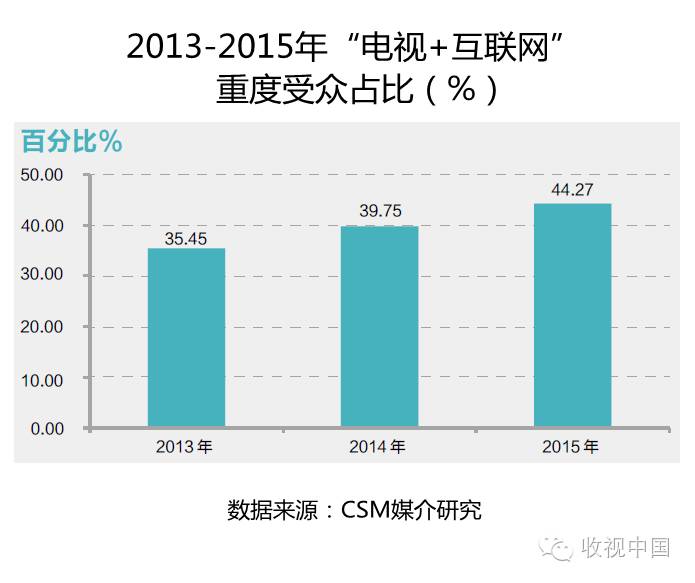 2013年,重度受众在所有受众中占比的35.45%;至2014年,占比上升至39.75%,较上一年上升了4.3个百分点;2015年,重度受众占比进一步保持上升态势,凭借4.52个百分点的增幅扩大到44.27%。三年间,“电视+互联网”重度受众占比共增长8.82个百分点。