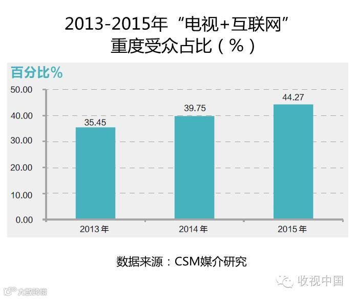 CSM媒介研究《电视广播视听率基础研究调查》12城市数据显示,2013-2015年间,“电视+互联网”重度受众(后文简称重度受众)规模逐年扩大。