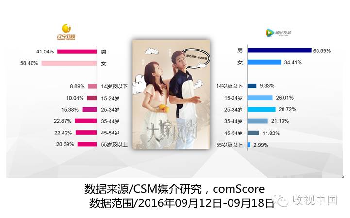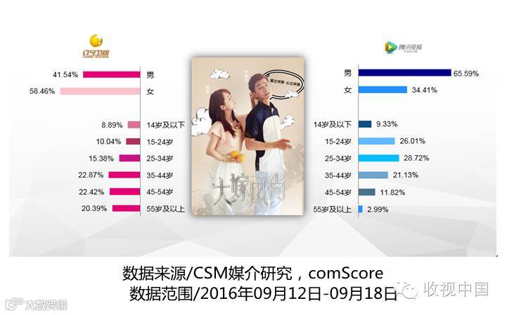 在电视端,《大嫁风尚》的女性观众比例高于男性,为58.46%;从年龄分布上看,35-44岁、45-54岁和55岁及以上的观众为该剧的主要收视人群,分别为22.87%、22.42%%和20.39%。在PC端,该剧在腾讯视频的男性观众比例明显高于女性,为65.59%,与电视端形成反差;同时,从年龄分布上看,15-24岁和25-34岁的观众为该剧的主要收视人群,分别为26.01%和28.72%。