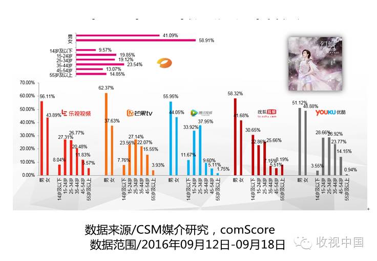 在电视端,《幻城》的女性观众比例明显高于男性观众,为58.91%;从年龄分布上看,35-44岁的观众比例最高,为23.54%;PC端,乐视视频、芒果TV、腾讯视频、搜狐视频和优酷网均为的男性观众比例均高于女性,与电视端形成强烈反差,其中芒果TV的男性观众比例最高,为62.37%;从年龄分布上看,15-24岁、25-34岁和35-44岁为PC端该剧的主要收视人群。
